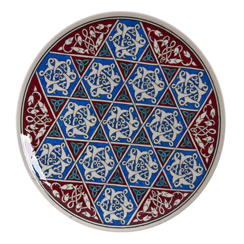 Rumiler Ve Geometriden Oluşan Özel Tasarım Sır Altı Çalışmasıdır.Bu eserde kırmızı ve mavi renkler kullanılmıştır.
