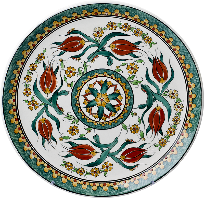 Tek olmanın sembolü olan lale motifi bu eserde konumlanmış ve etrafına küçük penç motifleri ile grup oluşturulmuş kırmızı,sarı ve yeşil renkler ile  sır altı tekniği kullanılan Klasik Osmanlı Desenlerinden Oluşturulmuş Kompozisyon Çalışmasıdır.