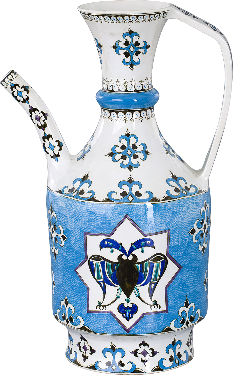 Üst kısımları beyaz zemin üzerine firuze renkte geometrik kare kenarları bitkisel lotus figürü şeklinde işlenmiştir. Aynı form ibrik ucunda da işlenmiş olup, orta kısım mavi zemin üzerine Selçuklu Yıldızı ve onun içerisinde çift başlı kartal motifi işlenmiştir. Çift başlı kartal gökyüzünün hakimi, gücün sembolü, doğu ve batının hakimi manasında genelde Sultanları olduğu yapılarda kullanılmıştır.