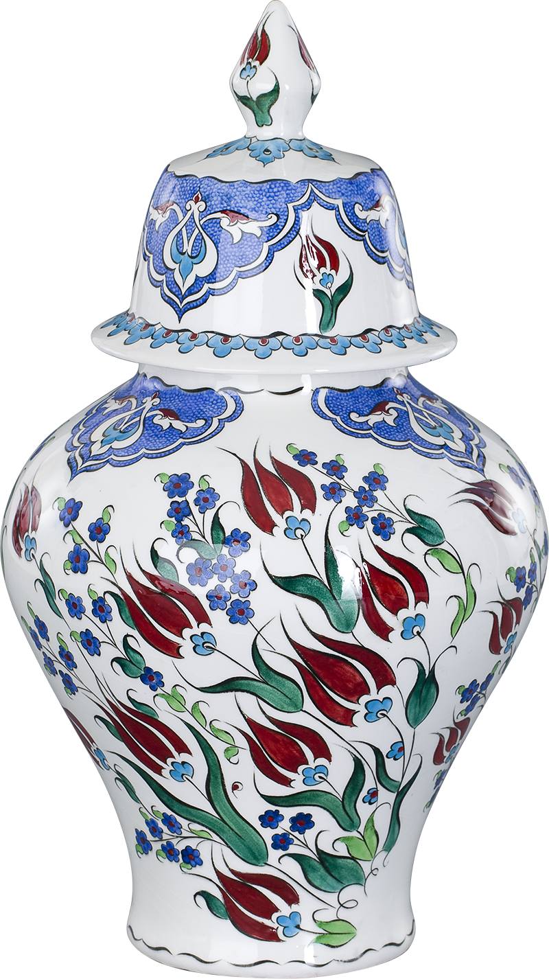 Tek olmanın sembolü olan lale motifi bu eserde konumlanmış ve etrafına küçük pençlerle grup oluşturulmuş mavi,turkuaz,kırmızı ve yeşil renklerle oluşmuş Klasik Osmanlı desenlerinden oluşturulmuş kompozisyon çalışmasıdır. Sır altı tekniği uygulanmıştır.