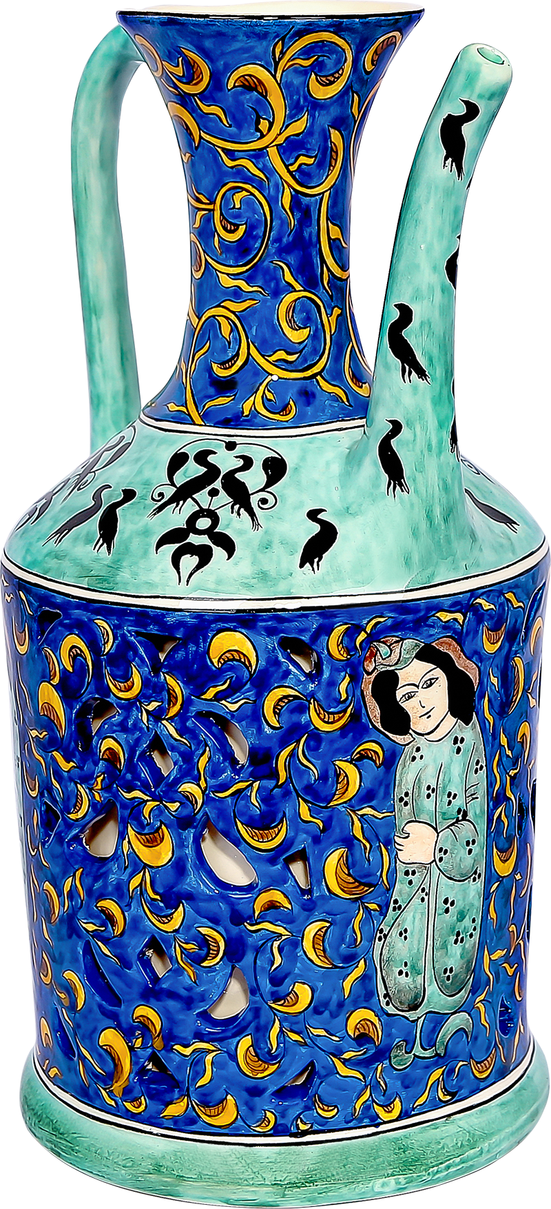 Eserin boğaz kısmında, mavi zemin üzerine hardal sarısı bitkisel figür- ler kullanılmıştır. Eserin kulpunda ve boğazının alt kısmında, firuze renkler üzerine siyah kuş figürleri işlenmiştir. Ortada diz üstü oturan bir kadın figürü kullanılırken, göbek kısmında ise mavi renkli zemin üze- rine hardal sarısı bitkisel figürler iş- lenmiştir.