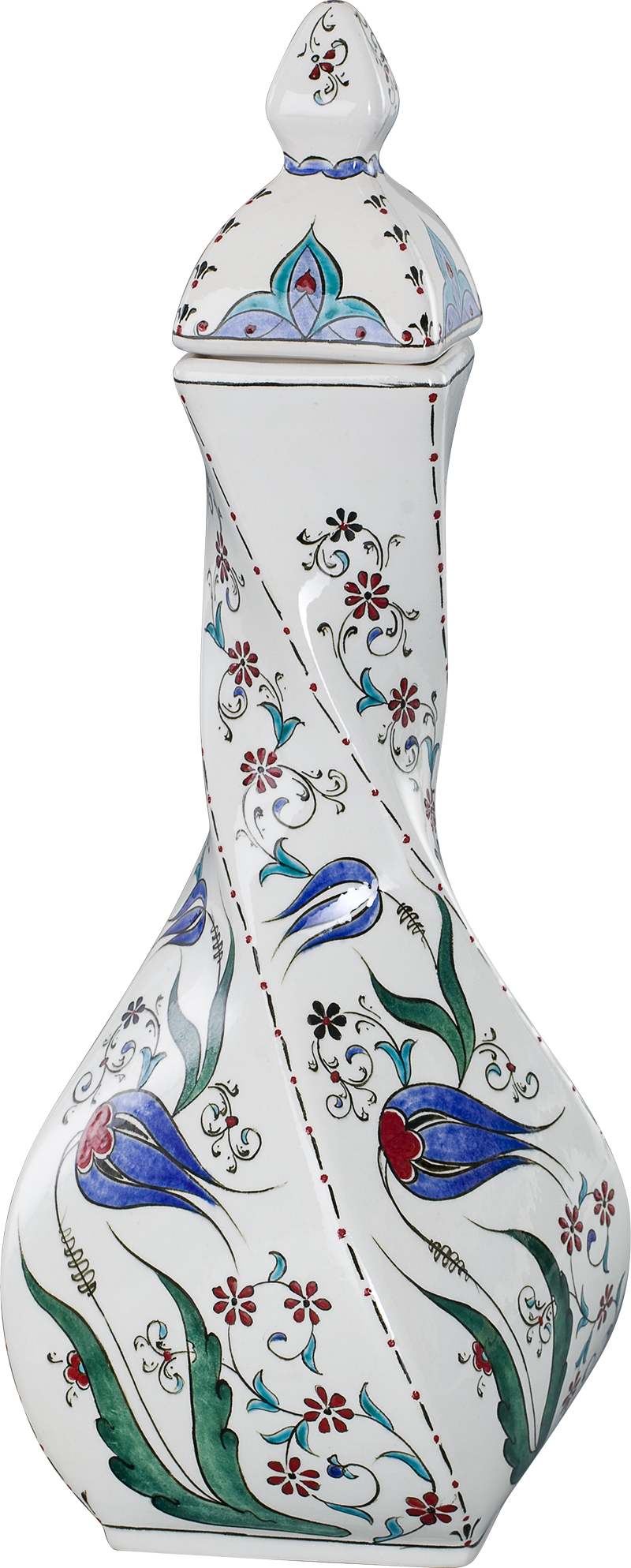 Tek olmanın sembolü olan lale motifi bu eserde konumlanmış ve etrafına rumi motifleri ile grup oluşturulmuş kırmızı ve turkuaz mavi renkler ile  sır altı tekniği kullanılan eser simetrili merkezden dışa doğru açılan rumi deseni ile tasarlanmıştır.Klasik Osmanlı Desenlerinden Oluşturulmuş Kompozisyon Çalışmasıdır. Sır Altı Tekniği Uygulanmıştır.