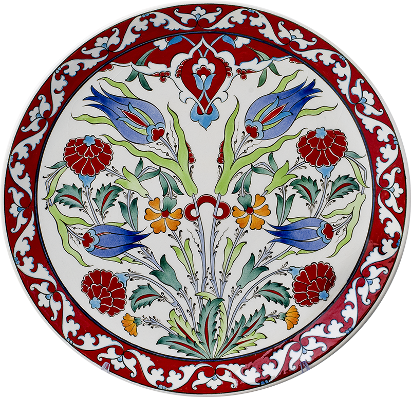 Tek olmanın sembolü olan lale motifi bu eserde konumlanmış ve etrafına küçük pençlerle grup oluşturulmuş mavi,turkuaz,kırmızı,sarı ve yeşil renklerle oluşmuş Klasik Osmanlı desenlerinden oluşturulmuş kompozisyon çalışmasıdır. Sır altı tekniği uygulanmıştır.