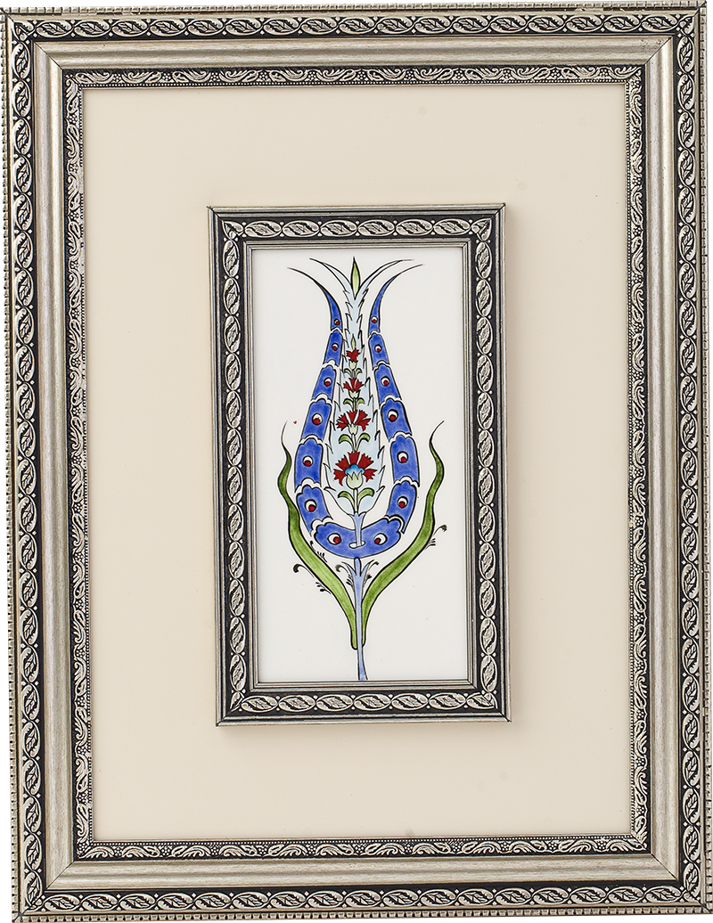 Çini sanatında en çok görülen çiçek motiflerinden biri lale desenidir. Lale Arapça kelime yazılış olarak Allah lafzını temsil ettiği için çokça kullanılmıştır. Sembol olarak da hilal şekline benzediği için Osmanlı sancağı olarak da anlamlandırılmıştır.Klasik Osmanlı Desenlerinden Oluşturulmuş Kompozisyon Çalışmasıdır. Sır Altı Tekniği Uygulanmıştır.