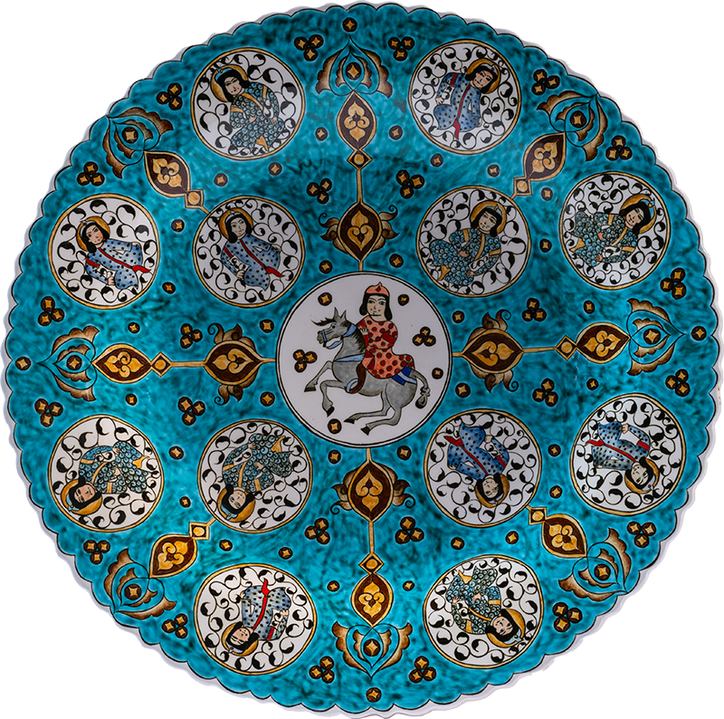 Eserin zemininde firuze renk iş- lenmiş olup, tabak merkezinde rozet içerisinde at süren bir sü- vari figürüişlenmiştir. Kenarların- da ise rozet içerisinde yüz hatla- rı tipik Selçuklu yüz hatları olan bağdaş    kurmuşinsan            figürleri kullanılmıştır. İnsan figürlerinin elbiselerinde tırazlar bulunmak- tadır. Eserde kullanılan,İnsan fi- gürlerin hepsinde başlarına taç işlenmiş olup, at süren süvari hariç başları hare içerisinealın- mıştır. Eserin boşluk kısımların- da, kahverengi zemin üzerine hardal sarısı Rumi ve geometrik süslemeler yer almaktadır.