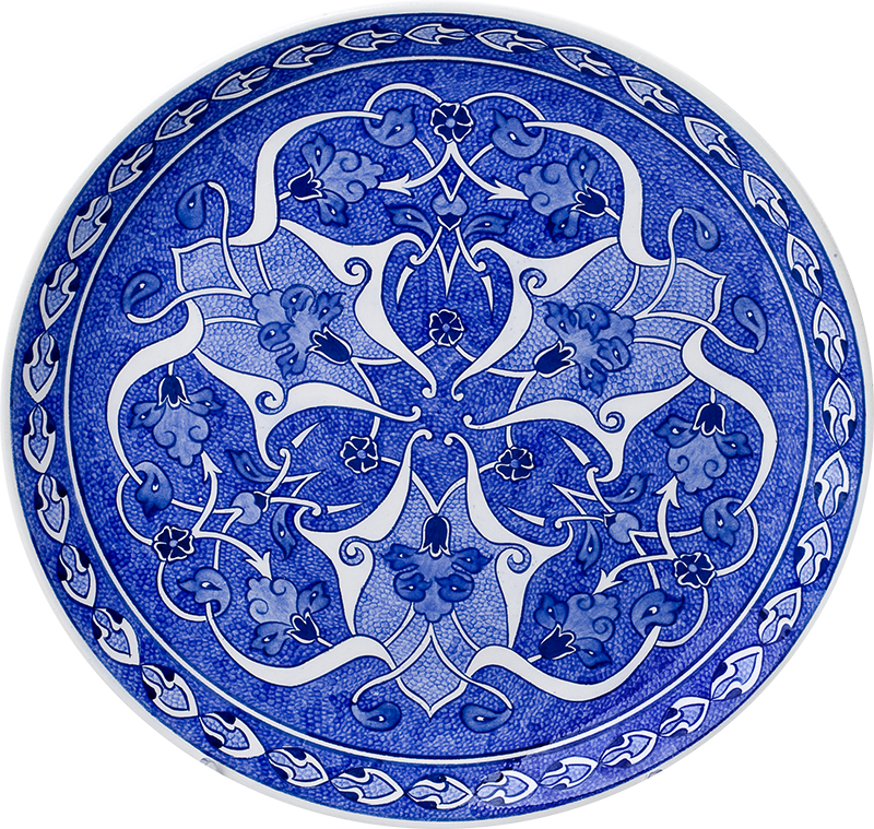 Bu eser  rumi desenlerinden mavi beyaz renklerden oluşan özel  kompozisyon tasarımdır sır altı tekniği uygulanmıştır.