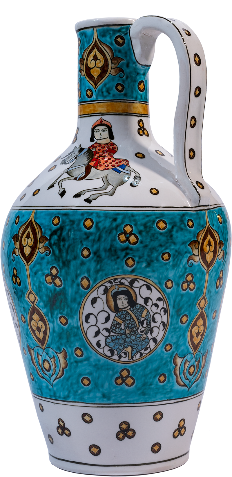 Eserin boğaz kısmında, firuze renk zemin üzerine kahverengi, hardal sarısı Rumi ve geometrik figürler kullanılmıştır. Alt kısmında ise beyaz zemin üzerinde at süren, başlarında taç olan Selçuklu yüz hatlarına sa- hip süvariler işlenmiştir. Eserin gö- bek kısmında firuze zemin üzerine, rozetler içerisinde bağdaş kurmuş tipik Selçuklu yüz hatlarına sahip insan figürleri kullanılmıştır. Kenarla- rında ise bitkisel figürler yer almak- tadır. Eserin göbek boşluklarında ise kahverengi zemin üzerine har- dal sarısı Rumi ve geometrik figürler işlenmiştir. En alt kısmında beyaz zemin üzerinde hardal sarısı ve geometrik figürler bulunmaktadır.