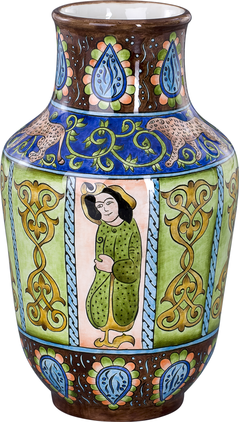 Üst kısımları kahverengi zemin üzerine mavi renkte damla motifleri, bir alt kısımda ise mavi zemin üzerine soyut bitki figürleri ile pars figürleri bulunmaktadır. Orta kısımda diz üstüne oturmuş kadın figürü yeşil elbise ile işlenmiştir. Tipik Selçuklu yüz tipine sahiptir. Kenarlarında yeşil zemin üzerine altın sarısı Rumi figürleri bulunmaktadır. Her figür arasında firuze renkli geometrik şeritler işlenmiştir. Alt kısımda ise kahverengi zemin üzerine mavi dama figürleri işlenmiştir.