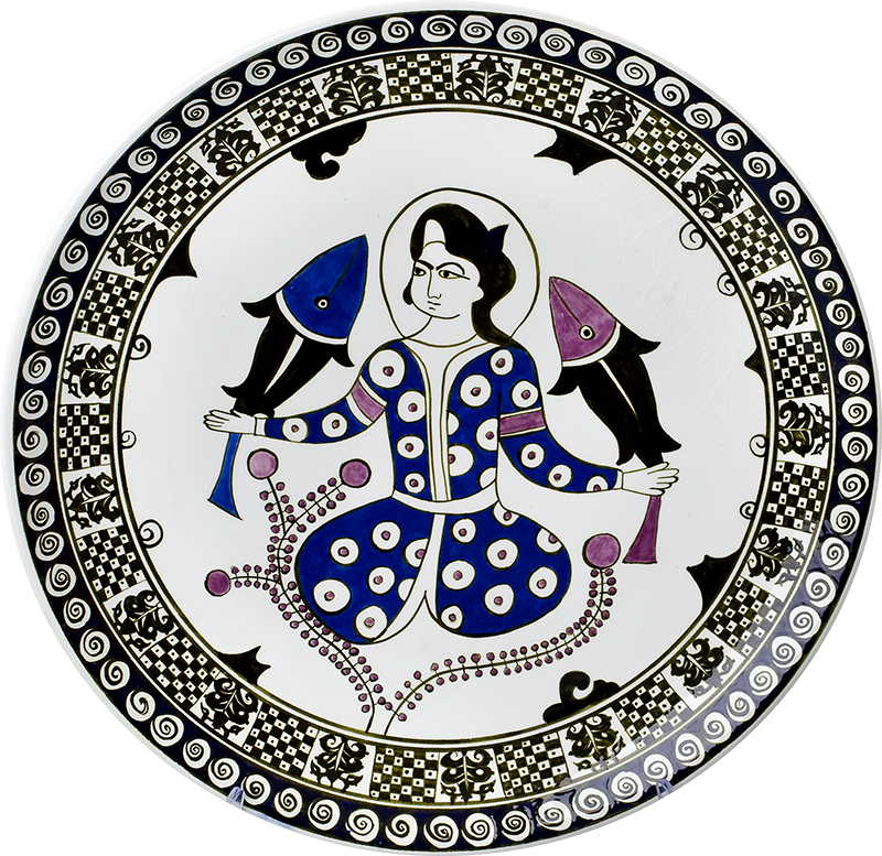 Kenarları siyah zemin üzerine stirilize bitki motifleri işlenmiştir. Bir sonraki bordürde sıralı halde dama ve bitkisel motifler işlenmiştir. Ortasında bağdaş kurup oturmuş ve iki elinde iki balık tutan insan figürü bulunmaktadır. Selçuklu çini formundan faydalanılmıştır.