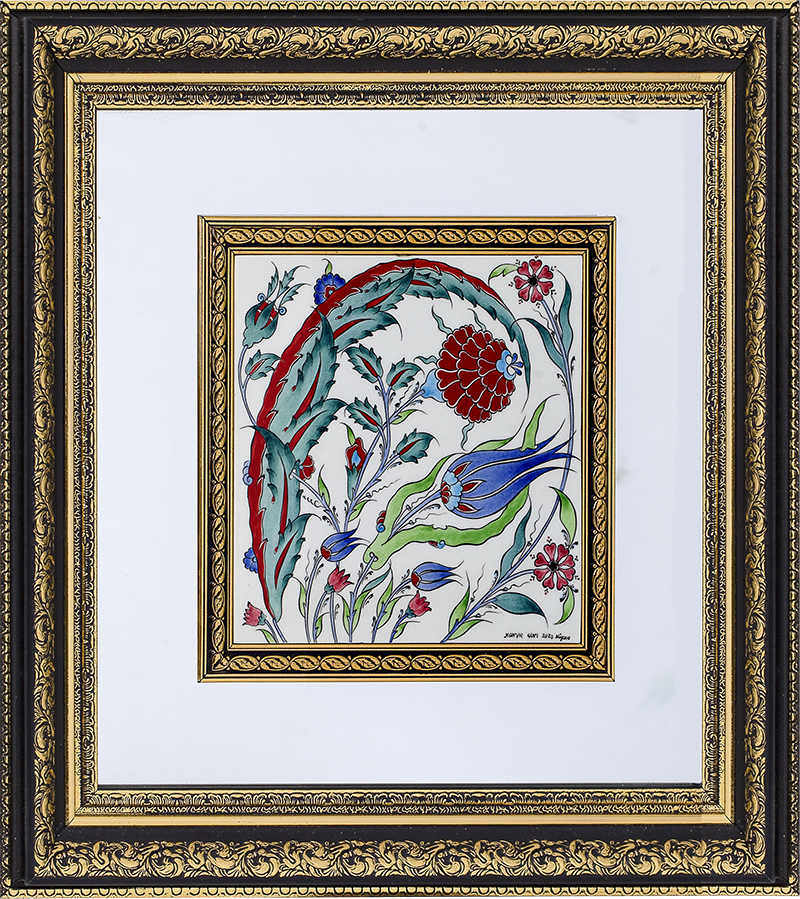 Lale, Gül, Karanfil Çini Motifleri dalı tek olan bir çiçek oldu için de tasavvufi manada Allah' ın birliğini ve aşkı temsil eder. Bu çini motifleri yenilenmeyi ve baharı simgeler. Bu eser Çinili Cami Çinilerinden Esinlenerek lale,gül ve karanfil desenleri iletasarlanmış sır altı tekniği uygulanmıştır.