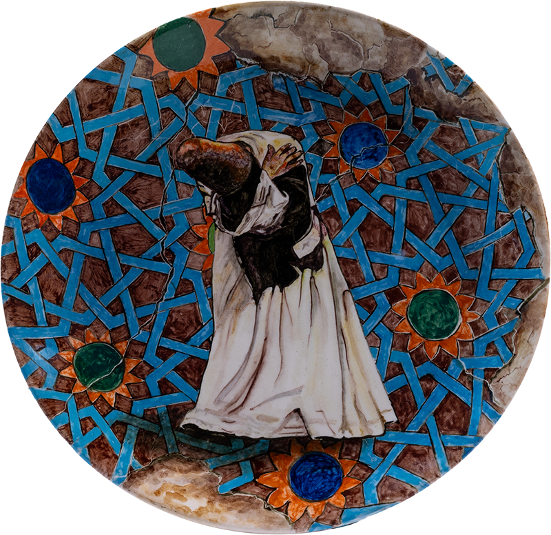 Eserde selam veren semazen etrafında firuze renkli geometrik figürler işlenmiş olup çevresinde ise yıldız motifleri işlenmiştir. Ze- min tamamı kahverengi olup se- mazen üzerindeki sikke ve tem- bure gibi Mevlevi kıyafetleri net bir şekilde resmedilmiştir.