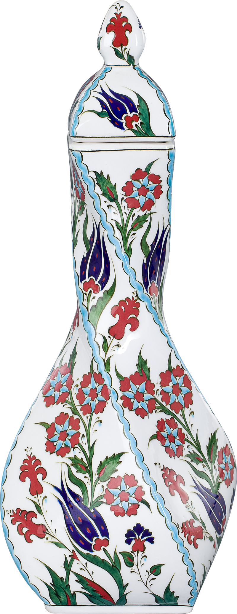 Tek olmanın sembolü olan lale motifi bu eserde konumlanmış ve etrafına küçük pençlerle grup oluşturulmuş mavi,turkuaz,kırmızı ve yeşil renklerle oluşmuş Klasik Osmanlı desenlerinden oluşturulmuş kompozisyon çalışmasıdır. Sır altı tekniği uygulanmıştır.