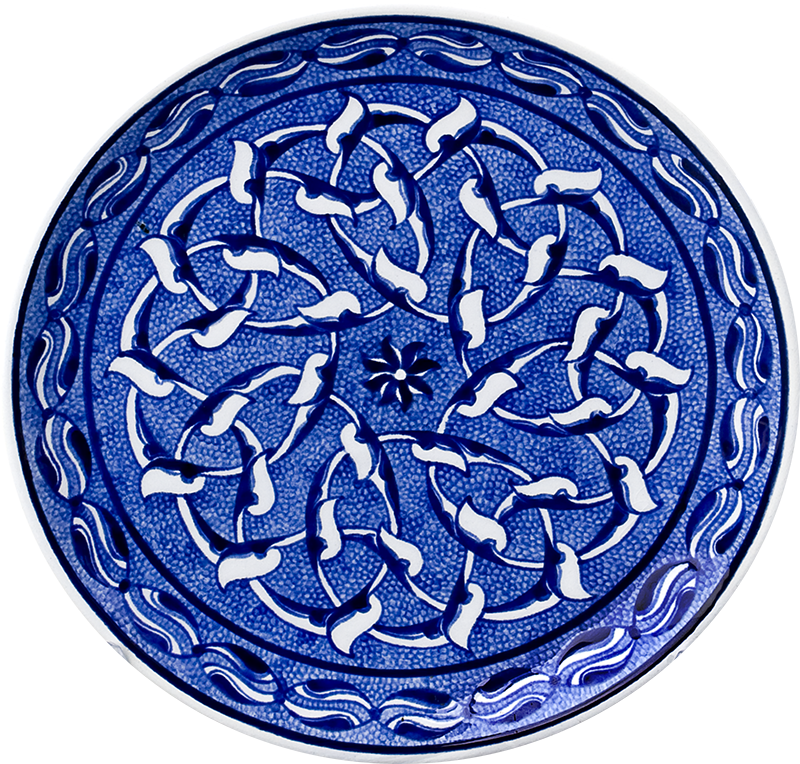 Bu eser  rumi desenlerinden oluşan mavi beyaz renklerl ile özel  kompozisyon tasarımdır sır altı tekniği uygulanmıştır.