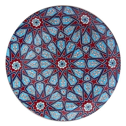 Bu eser Selçuklu yıldızı  deseninden  oluşturulmuş turkuaz ve kırmızı renkleri ile oluşturulan  kompozisyon çalışmasıdır. Sır altı tekniği uygulanmıştır.