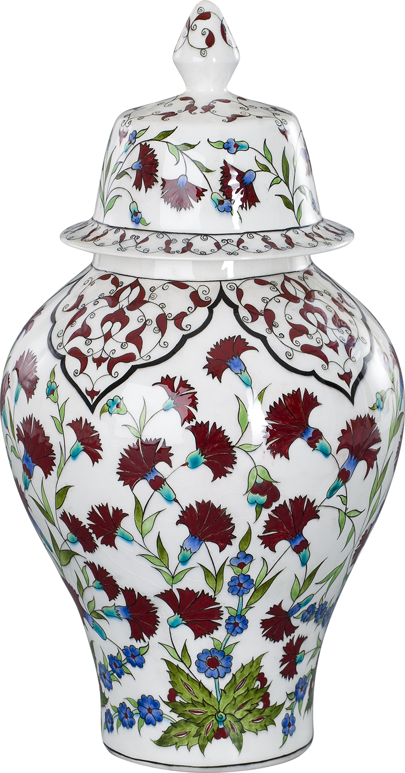 Tek olmanın sembolü olan karanfil  motifi bu eserde konumlanmış ve etrafına rumi motifleri ile grup oluşturulmuş kırmızı ve turkuaz mavi renkler ile  sır altı tekniği kullanılan eser simetrili merkezden dışa doğru açılan rumi deseni ile tasarlanmıştır.Klasik Osmanlı Desenlerinden Oluşturulmuş Kompozisyon Çalışmasıdır. Sır Altı Tekniği Uygulanmıştır.